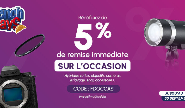 Durant les French Days, Digit-Photo met en avant son catalogue d’occasion avec une offre spéciale : 5 % de remise supplémentaire sur plus de 200 produits, en utilisant le code FDOCCAS.
